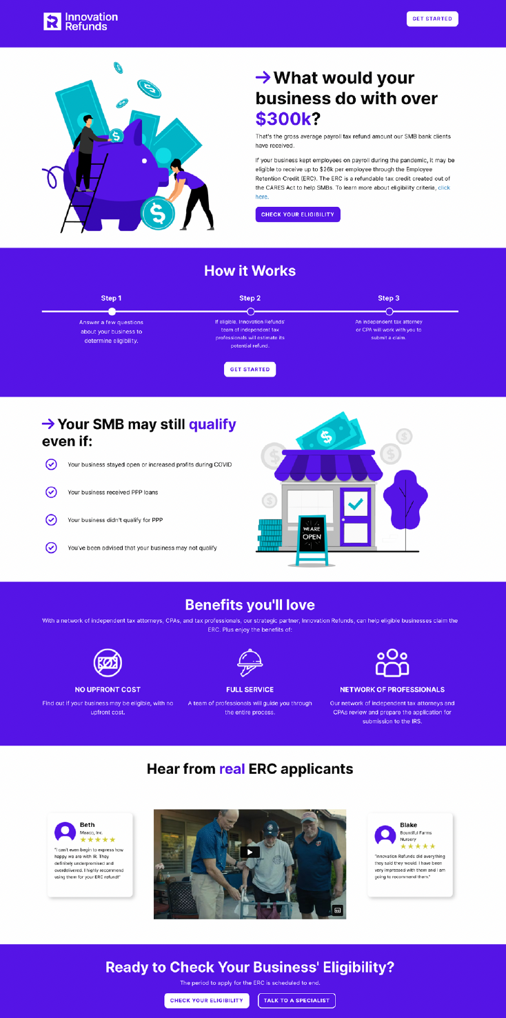 Innovation Refunds helps small and mid-sized businesses access the Employee Retention Credit (ERC), a complex federal tax program created in response to COVID-related business disruption. The work spanned education, acquisition, partnerships, and product support, requiring clear, credible messaging across multiple channels.