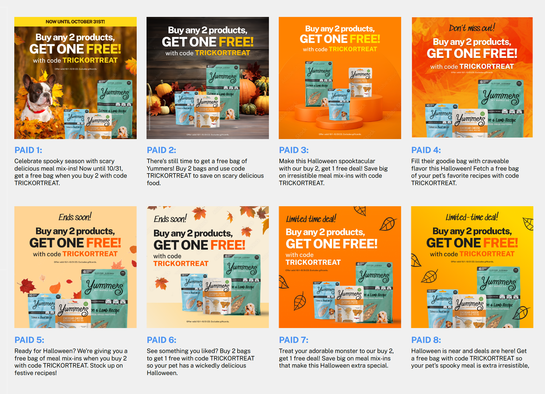 Seasonal moments such as Halloween and Labor Day were used to introduce urgency without sacrificing brand tone. Campaigns paired clear promotional mechanics with lighthearted, pet-first storytelling to keep the messaging fun rather than transactional.